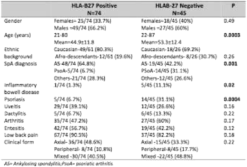 Table 1 (abstract P052). COMPARISON OF SPONDYLOARTHRITIS (SpA) PATIENTS WITH AND WITHOUT HLA-B27