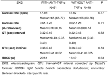 Table 1 (abstract P444). Electrocardiographic findings in SpA (SpondyloArthritis) patients with and without anti TNF-α treatment